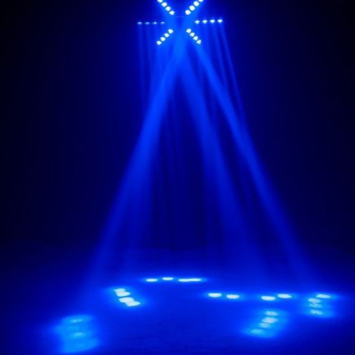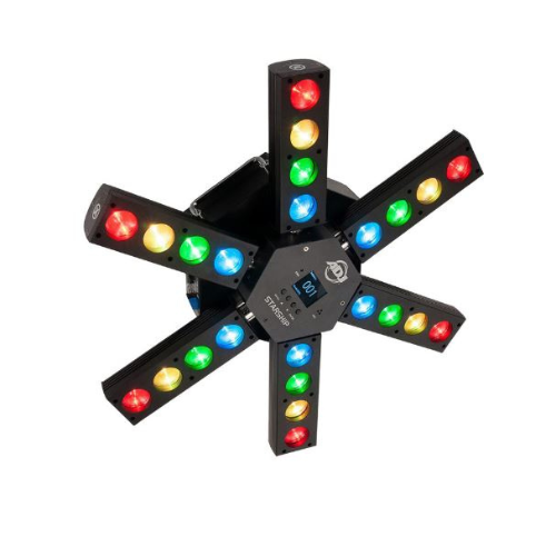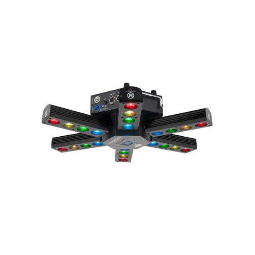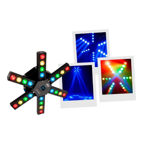 Chaque bras du Starship embarque quatre LED Quad RGBW de 15 W. Ainsi, vous obtenez un total de 24 sources lumineuses contrôlables individuellement. De plus, les bras pivotent sur 95°, ce qui crée des faisceaux aigus et précis. Grâce aux macros de couleur intégrées, aux modes stroboscopiques et aux effets animés, vous créez des ambiances énergiques et vivantes, sans aucune interruption — la machine fonctionne toute la nuit, sans cycle de repos.