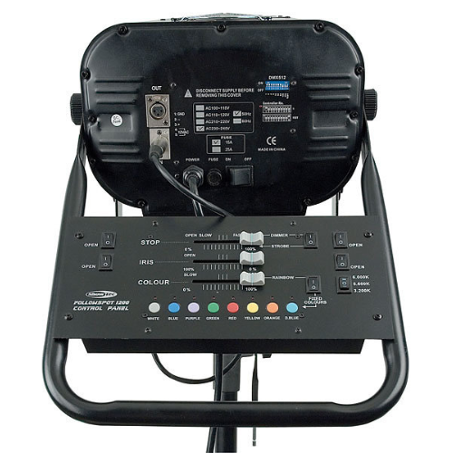 Contrairement à un projecteur classique, le Follow Spot 1200 Pro propose de nombreux réglages. Sa roue de couleurs intègre plusieurs filtres dichroïques, permettant de créer des ambiances variées. Vous disposez aussi d’un filtre CTC pour ajuster la température de couleur, ce qui apporte plus de réalisme aux mises en scène. Son iris modulable réduit ou élargit le faisceau, passant de 4° à 38° selon vos besoins. Enfin, le dimmer fluide de 0 à 100 % permet de contrôler l’intensité lumineuse avec précision.