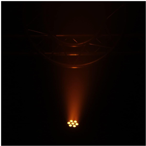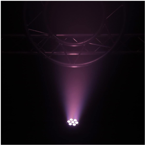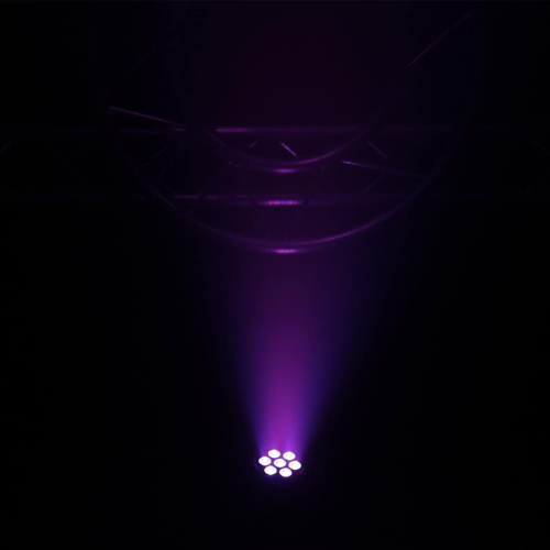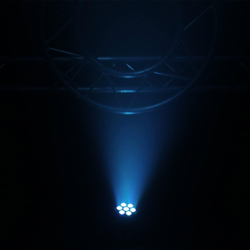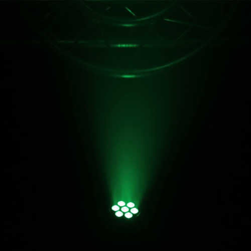Le projecteur propose plusieurs modes : DMX 5, 7 ou 9 canaux, maître/esclave et son actif. Il dispose d’un gradateur électronique 0-100 % et de macros de couleurs prédéfinies. Son faisceau de 25° assure une couverture uniforme, sans ombres, sur de grandes surfaces. Vous pouvez ainsi créer des ambiances personnalisées facilement.