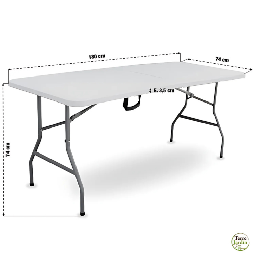 Sa structure en acier avec revêtement époxy assure une excellente solidité, tandis que son plateau en plastique blanc haute densité garantit légèreté et résistance aux chocs, à l’humidité et aux taches. Ainsi, cette table est parfaitement adaptée aussi bien pour un usage intérieur qu’extérieur.